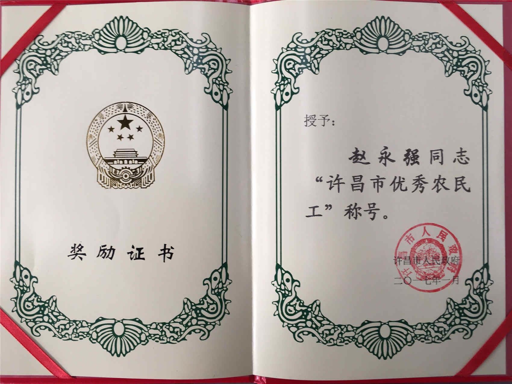 近日,從許昌市人力資源和社會保障局農(nóng)民工工作領導小組辦公室傳來喜訊,我公司數(shù)控車間員工趙永強同志,獲得“許昌市優(yōu)秀農(nóng)民工”稱號。